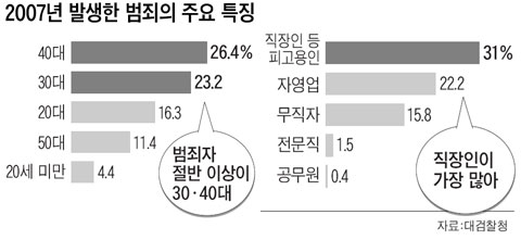 범죄자 연령대는 49%가 30~40대였으며, 20세 미만은 4.4%로 집계됐다.